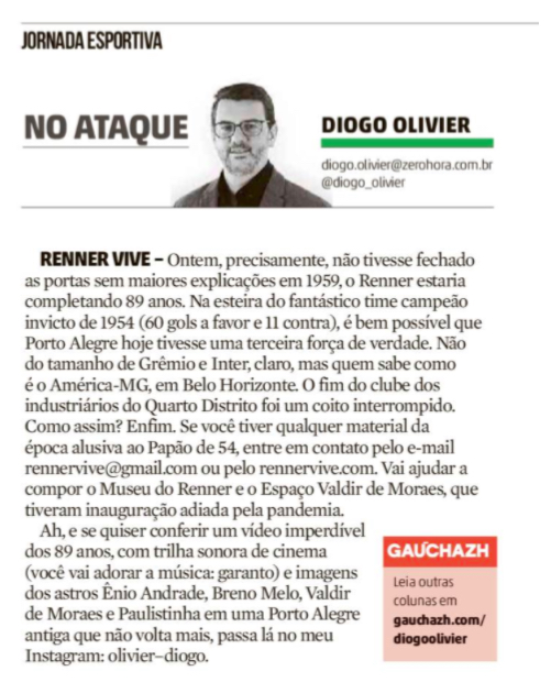 O projeto Renner Vive! continua causando comoção e mobilização na comunidade esportiva do Rio Grande do Sul. Em nota publicada na página 30 da Zero Hora de hoje, 28 de julho de 2020, Diogo Olivier exaltou as façanhas do Renner e incentivou o envio de materiais para esse projeto. O jornalista, filho de torcedor rennista, tem sido um dos maiores apoiadores da manutenção da chama do Papão de 54 acesa. Ficamos honrados e agradecidos pelo espaço que nos foi dado. O burburinho sobre o time do 4º distrito se espalhou pelo Estado e o ruído já se escuta de longe… Em breve mais novidades!
