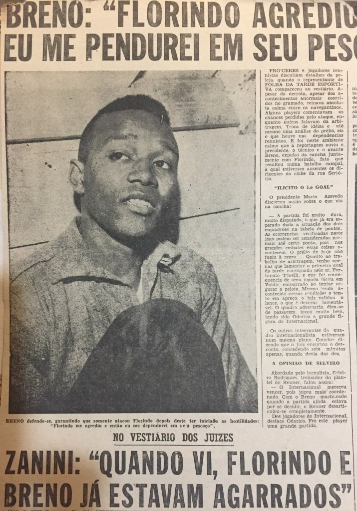 Em seguida, o que se sabe é que Breno, o lesionado, recebeu uma instrução de cinema vinda do banco de reservas: “agarra Florindo, dá uma gravata”. A intenção era clara: deixar os dois times com 10 jogadores. Sem pestanejar, o atacante, já treinando seus dotes de ator, aproveitou um lance de ataque rennista para executar o roteiro previsto. Com uma atuação digna de oscar, Breno se pendurou no pescoço do zagueiro colorado até ele reagir com um furioso empurrão. Imediatamente após o lance, os dois foram expulsos e a confusão estava formada.