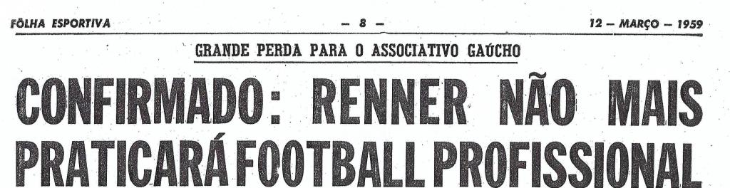 Em 12 de março de 1959, cinco dias após a vitória contra o Guarany, em Cachoeira do Sul, a Fôlha Esportiva noticiou a tragédia: “Confirmado: Renner não mais praticará football profissional”. A manchete, absolutamente inesperada, abalou os jogadores, a torcida rennista e toda a comunidade que acompanhava a espetacular trajetória do time dos industriários. Era o fim do maior fenômeno sociocultural que a cidade de Porto Alegre já presenciou. A comoção era inevitável.