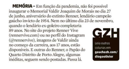 Uma honra ter o projeto Renner Vive! lembrado mais uma vez na coluna ‘No Ataque’ do jornalista Diogo Olivier. A nota, publicada na edição de hoje do jornal Zero Hora, cita algumas das relíquias que compartilhamos por aqui. E lembra, também, que o Memorial Valdir Joaquim de Morais está prestes a ser inaugurado. Será um espaço destinado a salvaguardar a memória de um clube que conquistou e marcou uma geração. E que, mesmo depois de 61 anos do encerramento de suas atividades, continua a encantar pela sua trajetória meteórica. O Renner Vive!
