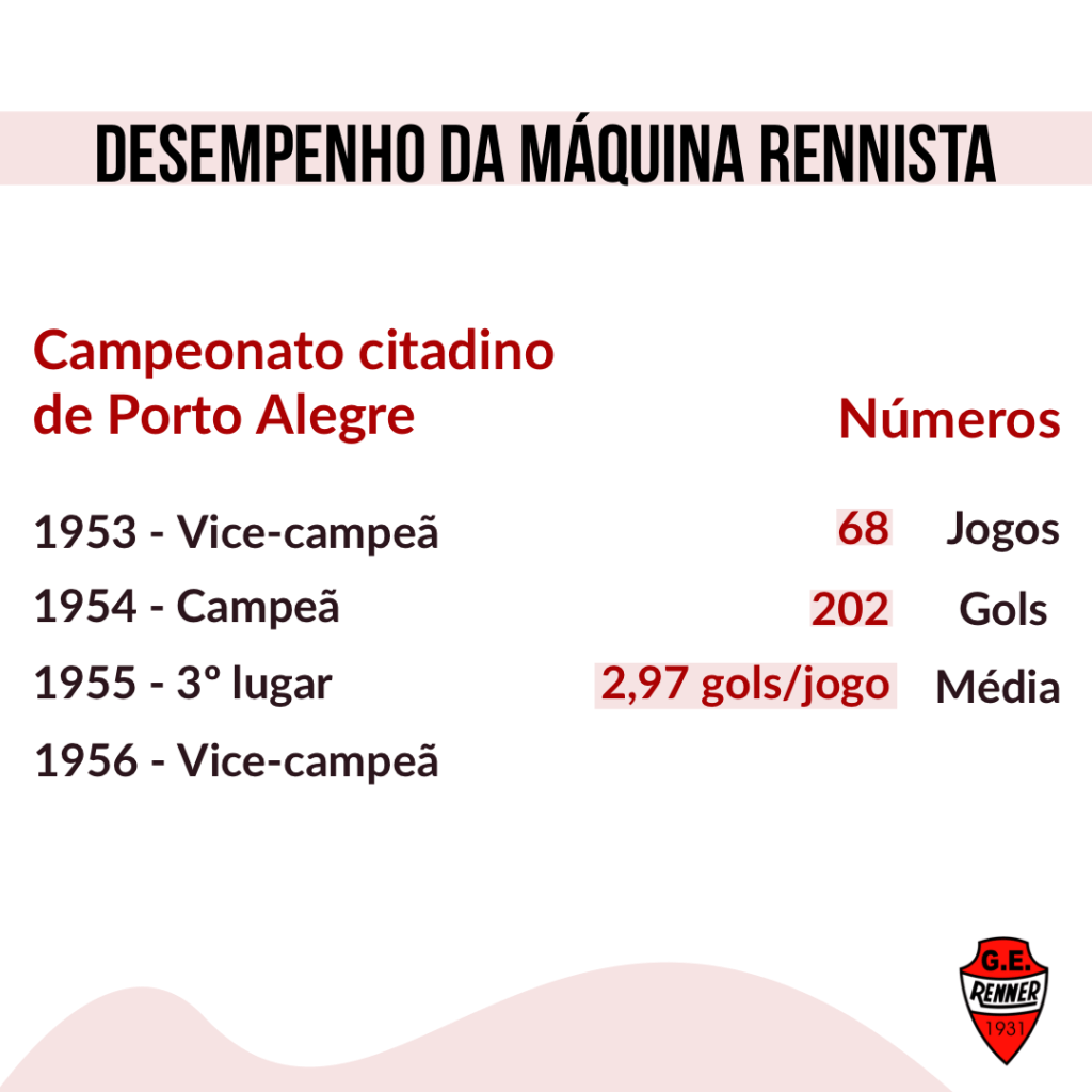 Em seus áureos tempos, o G. E. Renner era conhecido como “A Máquina”. Tal como um mecanismo industrial, o time do 4º distrito de Porto Alegre tinha as suas engrenagens perfeitamente ajustadas, o que levava a equipe a apresentar um entrosamento fantástico. Pra completar, o esquadrão tinha qualidade técnica de sobra e um espetacular preparo físico. Em qualquer esquema tático, WM ou 4-2-4, o resultado era quase sempre positivo.