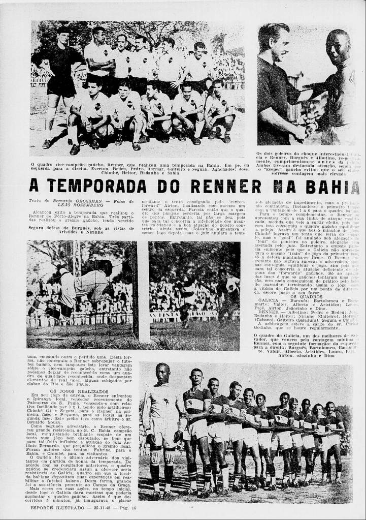 “Realizou o Renner na Bahia 3 partidas, com uma vitória, um empate e uma derrota. Os Vices Campeões Gaúchos tem um quadro de qualidade reconhecida, onde despontam elementos de real valor, alguns cobiçados por clubes do Rio e São Paulo. Os jogos realizados foram: Ipiranga 1 x 3 Renner, Bahia 1 x 1 Renner e Galícia 1 x 0 Renner.”