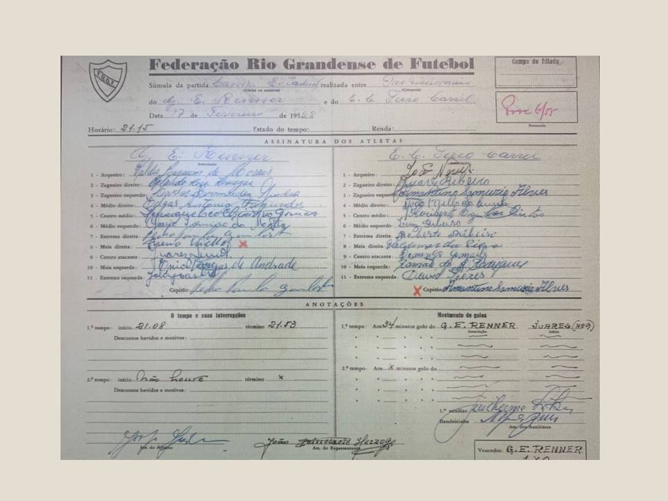 Renner: Valdir, Orlando e Paulistinha; Bonzo, Léo e Olávio; Pedrinho, Breno, Juarez, Ênio Andrade e Joeci.