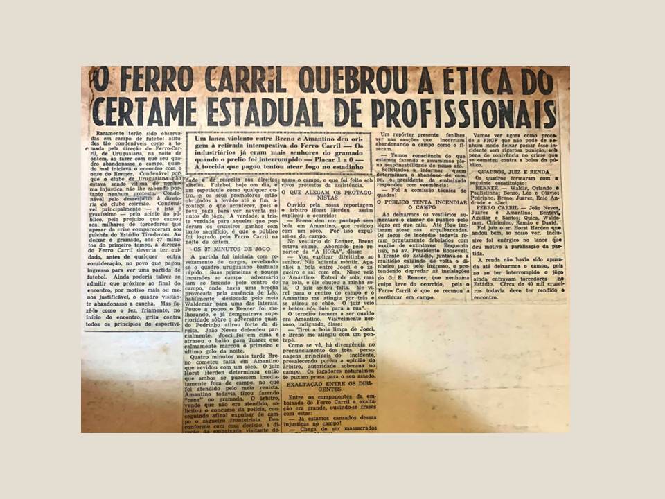A direção do Ferro Carril, intempestivamente resolveu retirar os jogadores do gramado, sem ter o cuidado, antes de qualquer outra consideração, no povo que pagou ingresso para ver uma partida de futebol. O Público presente era formado por torcedores Rennistas, mas também dos outros clubes da Capital interessados em ver o Campeão Renner na disputa do Estadual.