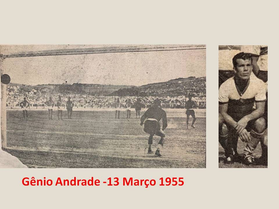 Imagem 01: Gol de Gênio Andrade com Gilmar paralisado. Imagem 02: Seleção Gaúcha Renner: Valdir, Orlando e Paulistinha; Bonzo, Léo e Ênio