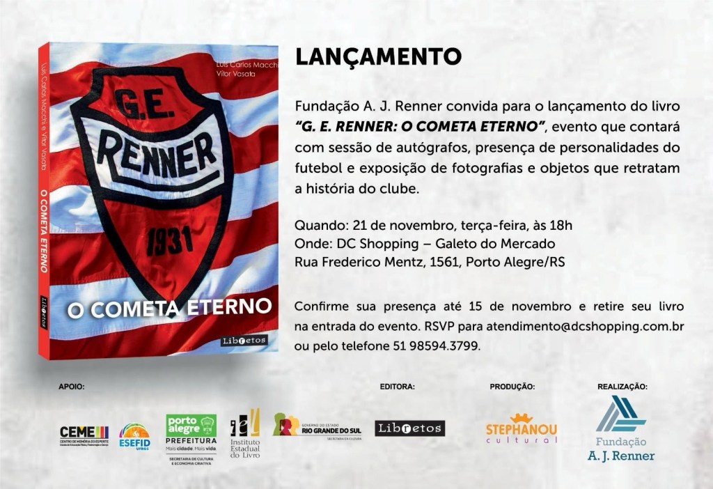 G.E.Renner – O Cometa Eterno – Lançamento: 21 de Novembro Publicado porrennervive12 de novembro de 2023Publicado emSem categoria Compartilhe isso: Clique para compartilhar no X(abre em nova janela) 18+ Clique para compartilhar no Facebook(abre em nova janela) Facebook Curtir Carregando... Publicado por rennervive Uma página dedicada ao Grêmio Esportivo Renner (1931-1959) Ver mais posts