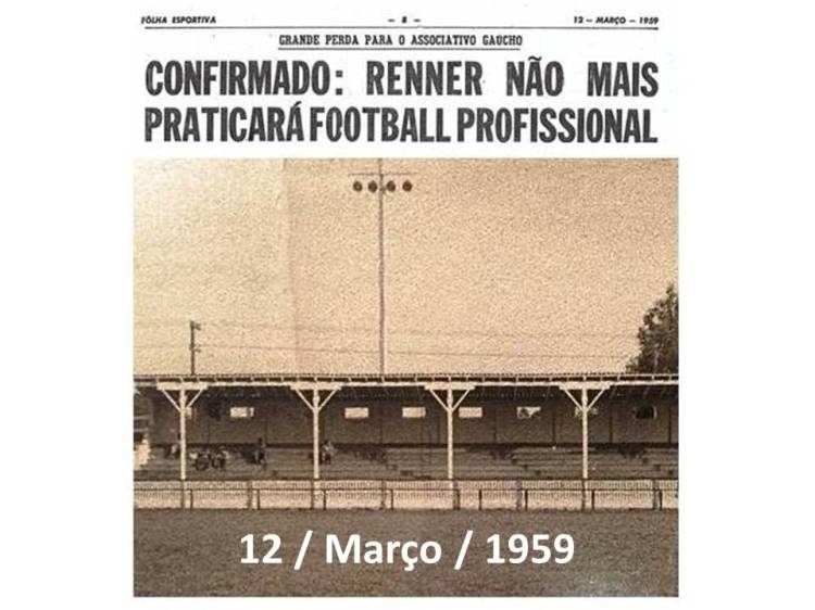 “Em vista do noticiário da imprensa local sobre a exclusão do G. E. Renner do campeonato profissional da cidade, desejamos prestar alguns esclarecimentos ao público. É preciso que se diga que o recuo da Avenida Sertório em quatro metros, atingindo o atual estádio do clube, não é o único motivo desta decisão. Destacamos entre estes fatores, o desvirtuamento das finalidades do Grêmio Esportivo Renner, mesmo com o nosso beneplácito, nestes últimos15 anos. Nascido do ideal de um grupo numeroso de funcionários da empresa, não titubeamos em dar amplo apoio à iniciativa pois dotaria a coletividade a prática dos esportes amadoristas, objetivo maior de sua fundação. Mais tarde, como decorrência do próprio sucesso no setor amadorista- ingressou o clube no football profissional , conquistando em tal categoria memoráveis e espetaculares lauréis, entre eles o próprio campeonato Citadino e Gaúcho. Acontece, também, que a empresa vinha arcando, anualmente, com o “déficit” do clube… em decorrência das constantes exigências do football profissional. Dessas quantias apenas uma importância irrisória era aplicada nos esportes amadoristas, verdadeiro motivo que se desejava alcançar quando da fundação do clube. Não temos nenhuma intenção de usar o clube com finalidade publicitárias, …não se enquadrava em nossos princípios de ética. ..a empresa entendeu que era excessiva a soma… com o futebol profissional, em detrimento da prática dos esportes amadoristas, que beneficiará um maior número de nossos colaboradores. Não são apenas os demais associados que estão sentindo o impacto dessa decisão. Nós também somos vulneráveis ao pesar que a todos dominou… Entretanto, temos que encarar a situação com base na realidade. E esta realidade, infelizmente , não nos leva a outra decisão.” P. Alegre, 11 de março de 1959 – A.J. Renner – Diretor Presidente